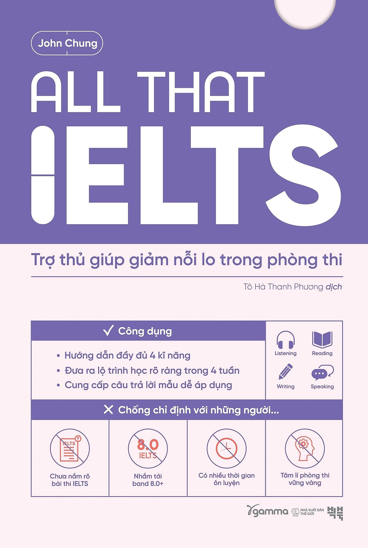 All that IELTS đưa ra những phân tích tổng quan về bài thi và các dạng câu hỏi thường gặp, giới thiệu các chiến lược làm bài thực tiễn, các cấu trúc và từ vựng thường gặp. Với các câu trả lời mẫu và mẹo hữu ích khi làm bài, cuốn sách giúp người học cảm thấy tự tin hơn khi bước vào phòng thi. Những bí kíp này không chỉ giúp giảm căng thẳng mà còn là "cứu cánh" cho người học khi gặp khó hoặc bị áp lực thời gian trong quá trình làm bài.