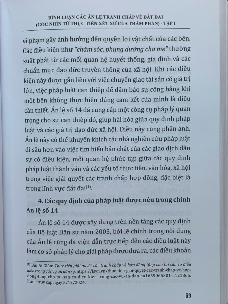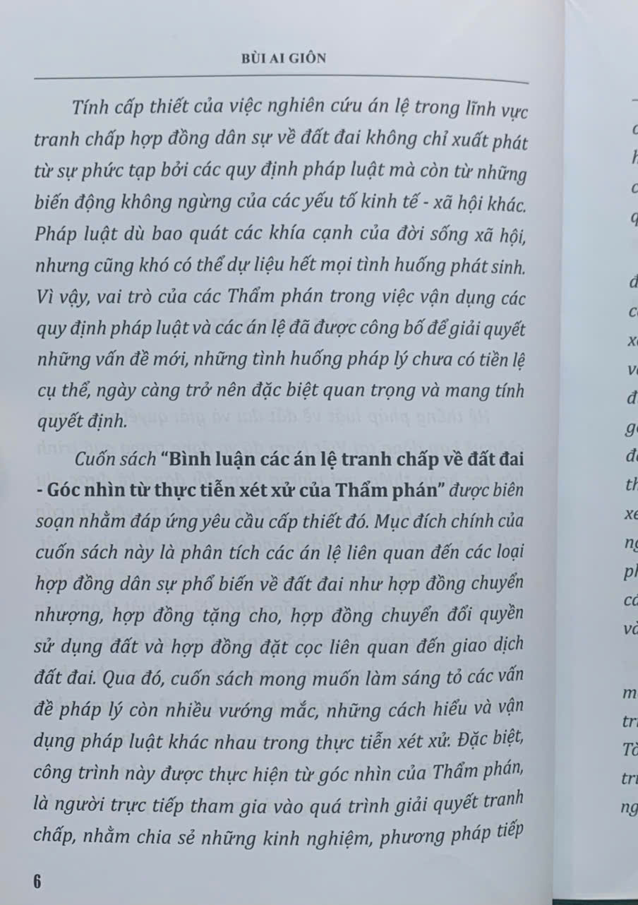 Cuốn sách “Bình luận các án lệ tranh chấp về đất đai – Góc nhìn từ thực tiễn xét xử của Thẩm phán” được biên soạn nhằm đáp ứng yêu cầu cấp thiết đó. Mục đích chính của cuốn sách này là phân tích các án lệ liên quan đến các loại hợp đồng dân sự phổ biến về đất đai như hợp đồng chuyển nhượng, hợp đồng tặng cho, hợp đồng chuyển đổi quyền sử dụng đất và hợp đồng đặt cọc liên quan đến giao dịch đất đai. Qua đó, cuốn sách mong muốn làm sáng tỏ các vấn đề pháp lý còn nhiều vướng mắc, những cách hiểu và vận dụng pháp luật khác nhau trong thực tiễn xét xử. Đặc biệt, công trình này được thực hiện từ góc nhìn của Thẩm phán, là người trực tiếp tham gia vào quá trình giải quyết tranh chấp, nhằm chia sẻ những kinh nghiệm, phương pháp tiếp cận trong việc vận dụng án lệ. Đồng thời, cuốn sách này cũng hướng đến mục tiêu góp phần nâng cao chất lượng xét xử các vụ án dân sự về đất đai, đảm bảo tính thống nhất và hiệu quả trong công tác xét xử.