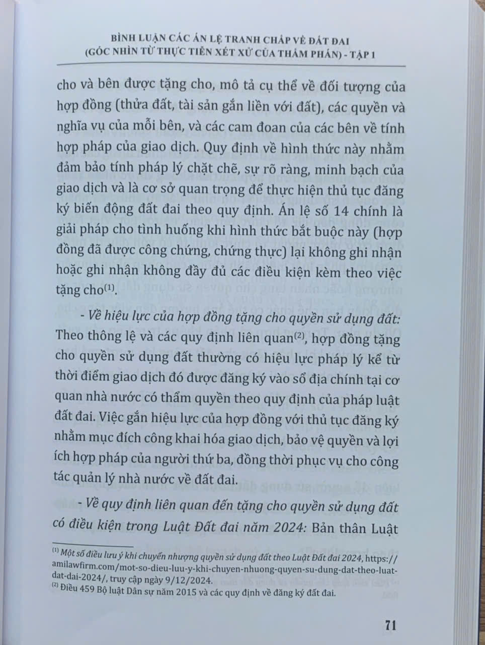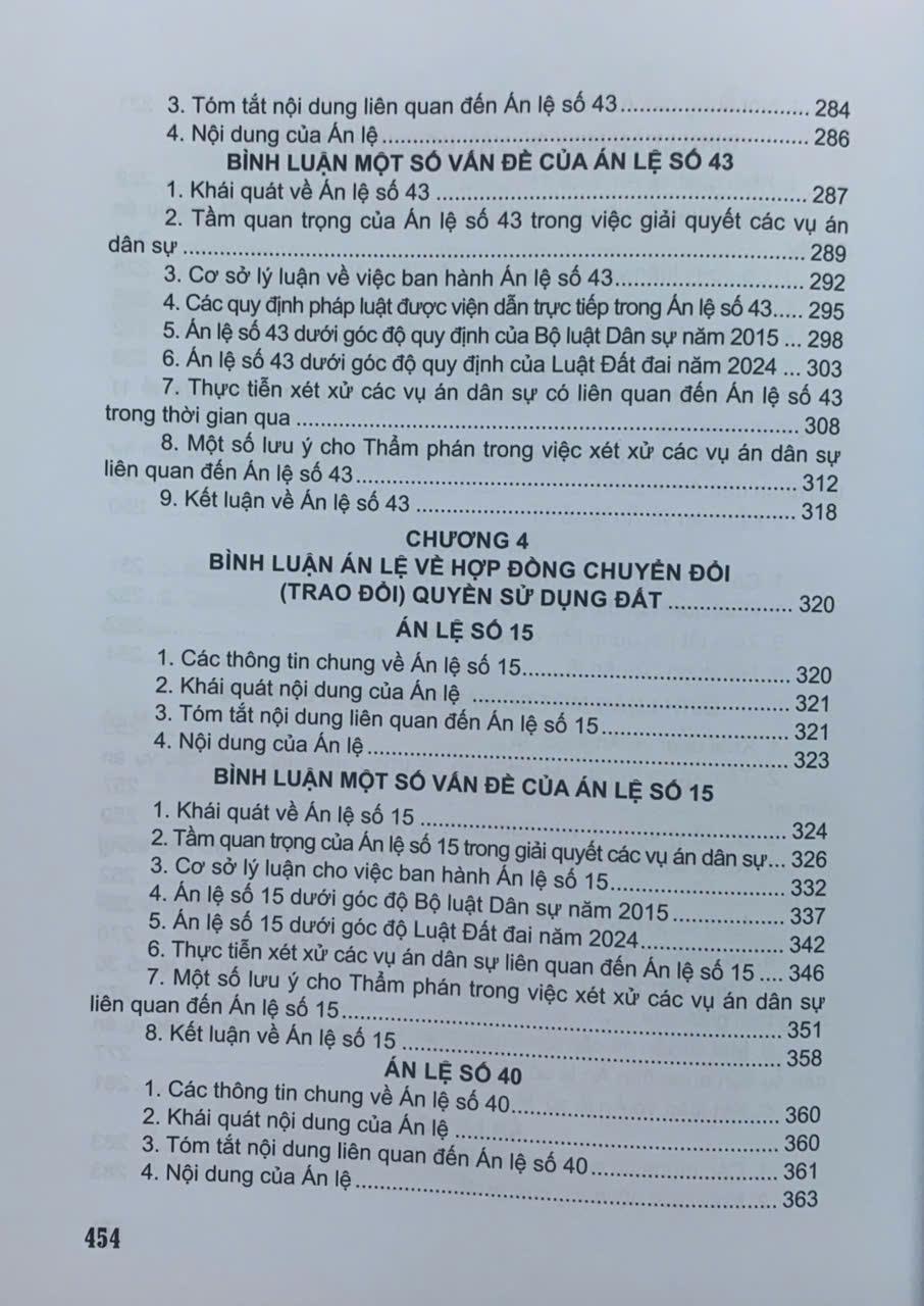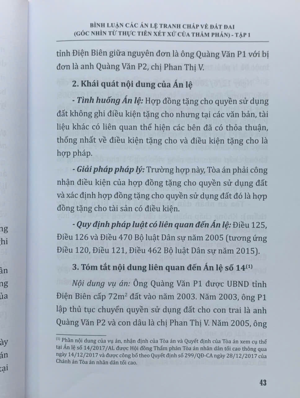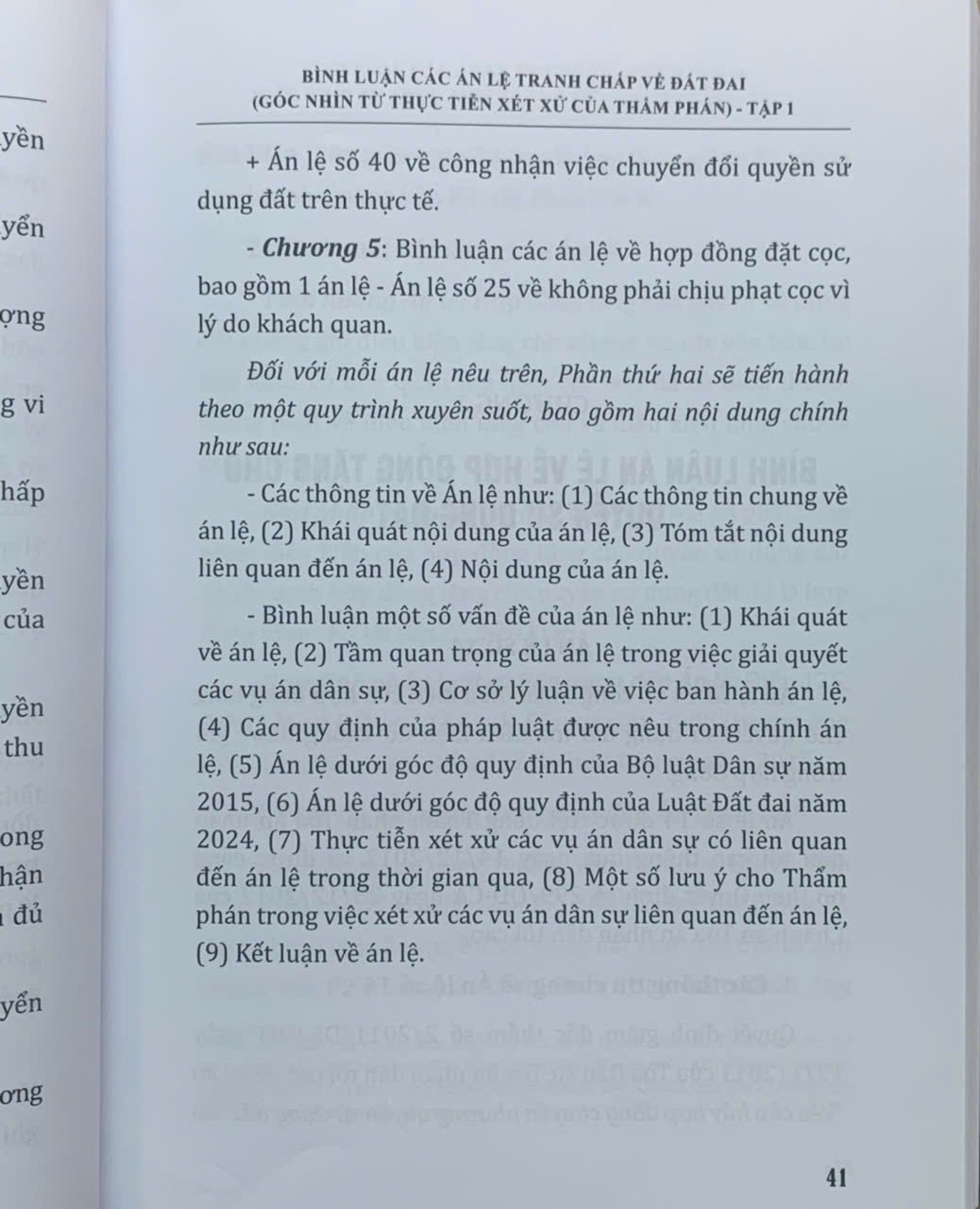 - Tập 1 tập trung vào các án lệ hợp đồng dân sự về đất đai (chuyển nhượng, tặng cho, trao đổi, đặt cọc).