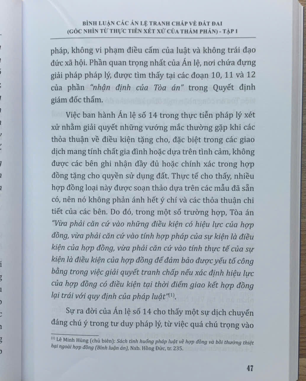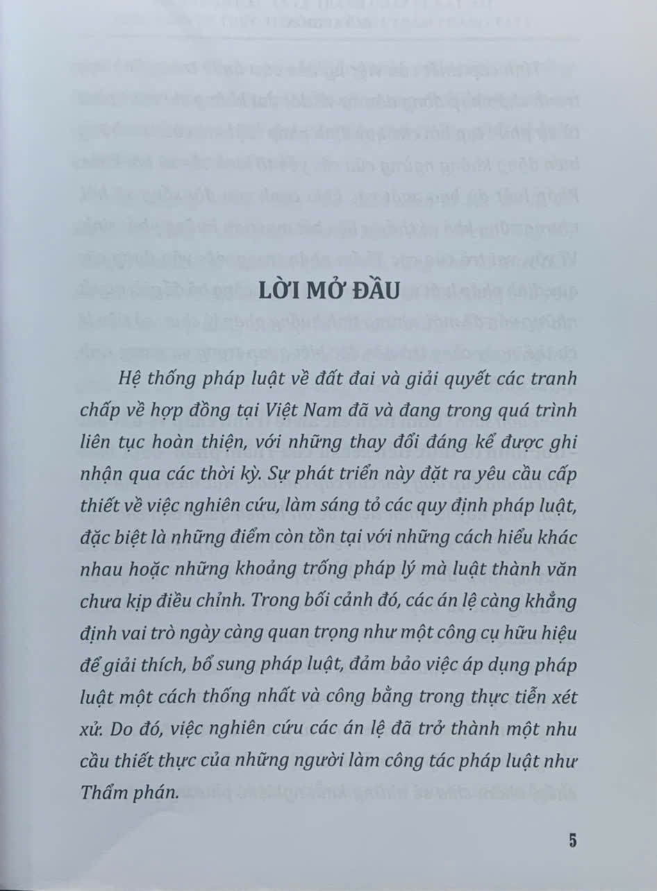 Hệ thống pháp luật về đất đai và giải quyết các tranh chấp về hợp đồng tại Việt Nam đã và đang trong quá trình liên tục hoàn thiện, với những thay đổi đáng kể được ghi nhận qua các thời kỳ. Sự phát triển này đặt ra yêu cầu cấp thiết về việc nghiên cứu, làm sáng tỏ các quy định pháp luật, đặc biệt là những điểm còn tồn tại với những cách hiểu khác nhau hoặc những khoảng trống pháp lý mà luật thành văn chưa kịp điều chỉnh. Trong bối cảnh đó, các án lệ càng khẳng định vai trò ngày càng quan trọng như một công cụ hữu hiệu để giải thích, bổ sung pháp luật, đảm bảo việc áp dụng pháp luật một cách thống nhất và công bằng trong thực tiễn xét xử. Do đó, việc nghiên cứu các án lệ đã trở thành một nhu cầu thiết thực của những người làm công tác pháp luật như Thẩm phán.