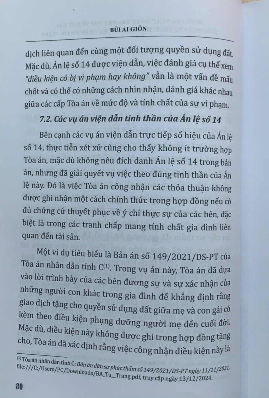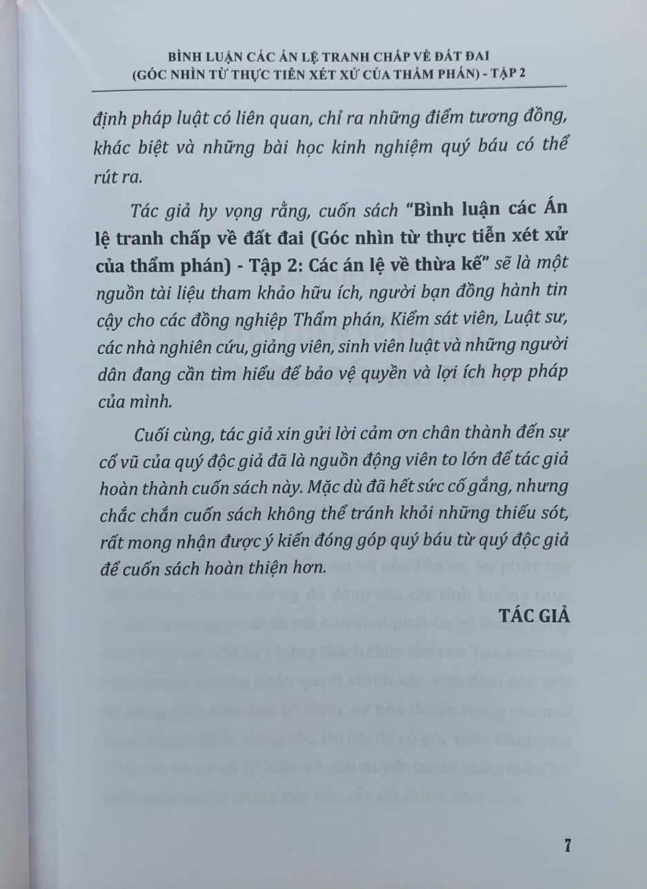 Tác giả hy vọng rằng, cuốn sách “Bình luận các Án lệ tranh chấp về đất đai (Góc nhìn từ thực tiễn xét xử của thẩm phán) – Tập 2: Các án lệ về thừa kế” sẽ là một nguồn tài liệu tham khảo hữu ích, người bạn đồng hành tin cậy cho các đồng nghiệp Thẩm phán, Kiểm sát viên, Luật sư, các nhà nghiên cứu, giảng viên, sinh viên luật và những người dân đang cần tìm hiểu để bảo vệ quyền và lợi ích hợp pháp của mình.