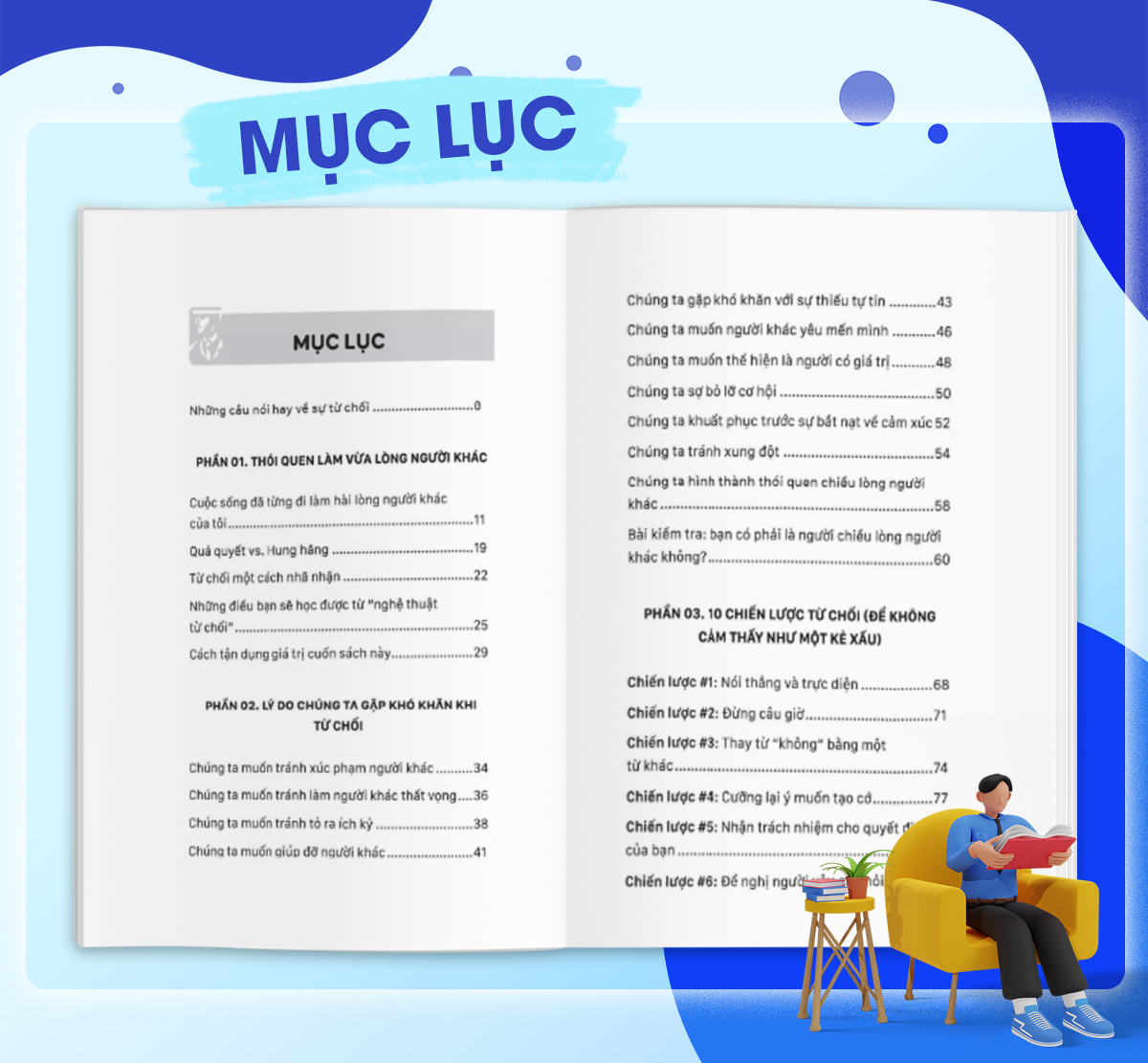 Bí quyết đưa ra lời Từ chối mà không làm tổn hại các mối quan hệ nằm “Nghệ Thuật Từ Chối – Cách Nói Không Mà Vẫn Có Được Đồng Thuận” giúp bạn tìm hiểu nguyên nhân và đưa ra cách từ chối “nhẹ nhàng”. Cuốn sách chia quy trình Từ chối thành những bước như- Chuẩn bị từ chối, đưa ra từ chối và hoàn tất từ chối - cuốn sách hướng dẫn bạn phương pháp nói Không hiệu quả, mạnh mẽ nhất, bạn có thể thực hiện ngay trong đời sống, công việc và các mối quan hệ.
