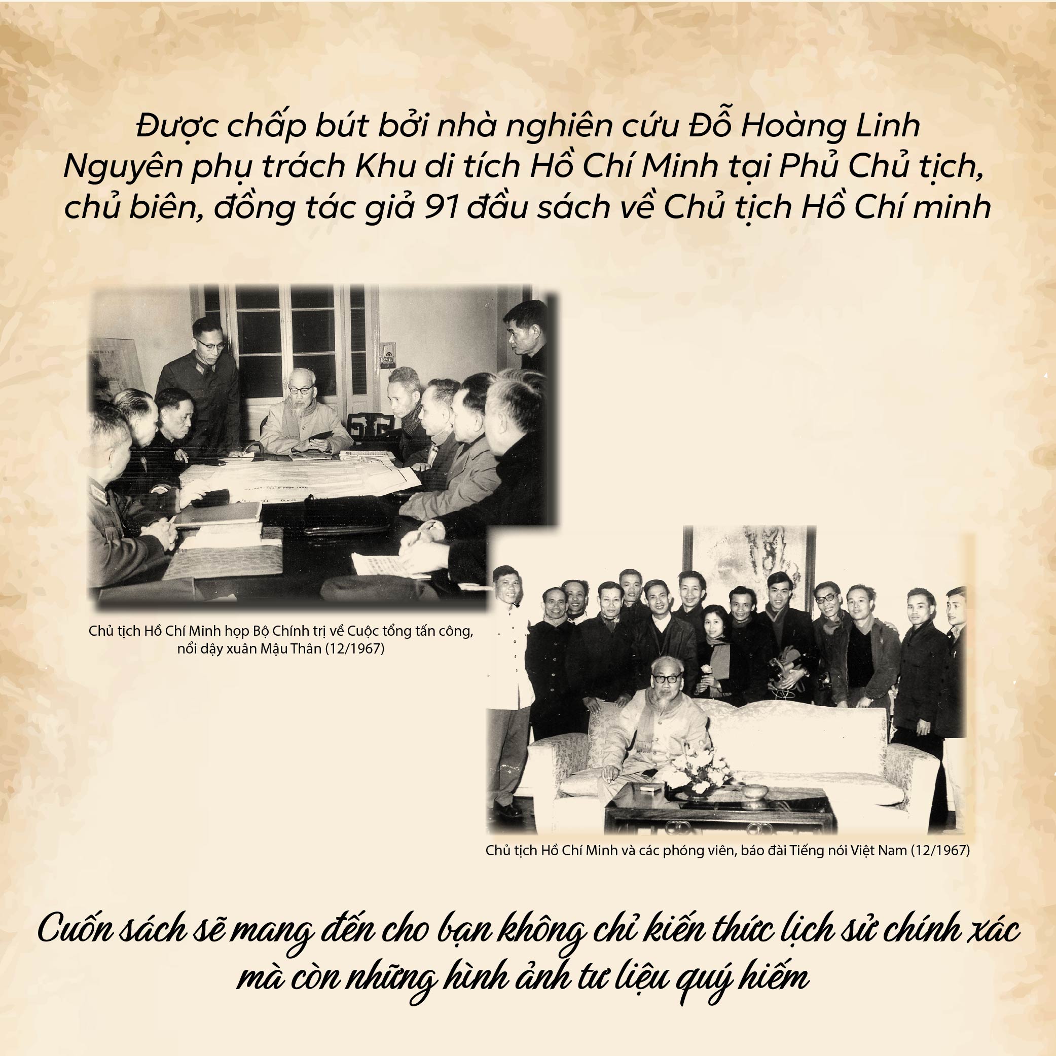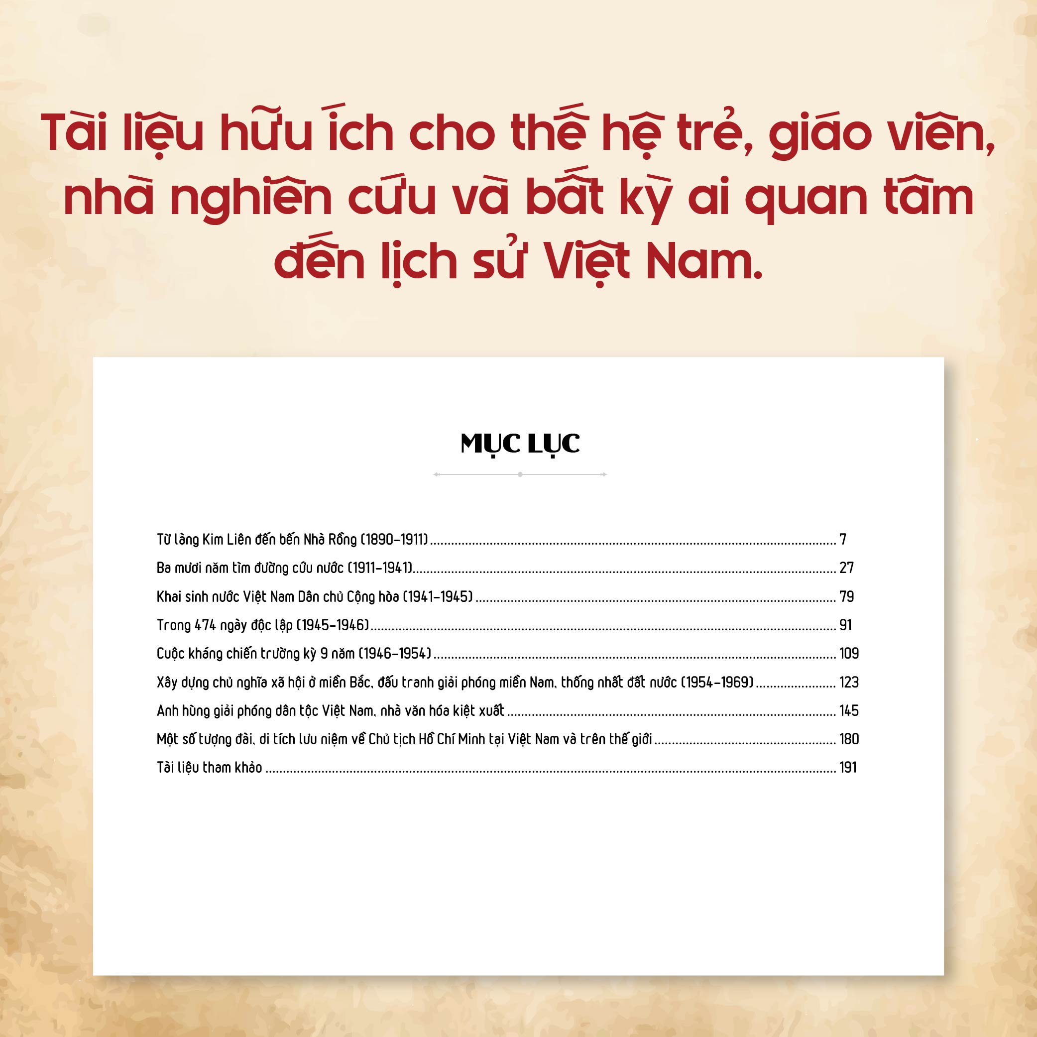 Từ những bức ảnh thôn quê nơi Người được sinh ra, các quốc gia Người từng đặt chân tới trên hành trình tìm đường cứu nước, một số bài báo Người từng viết hay giấy tờ, căn cước của Người khi còn hoạt động ở nước ngoài, đến hình ảnh Người trong thời kỳ kháng chiến gian nan hay những khoảnh khắc đời thường giản dị, cuốn sách dẫn dắt người xem đi qua từng chặng đường trong cuộc đời vĩ đại hơn nửa thế kỷ của vị cha già dân tộc.