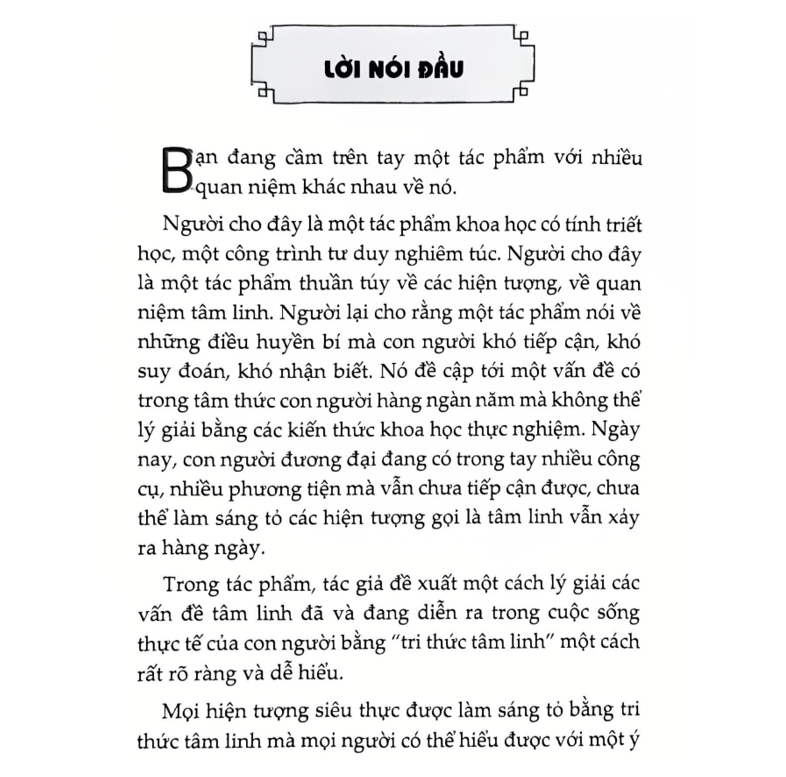 Sự kết hợp có chọn lọc cả những quan niệm đúng và cả quan niệm sai của loài người, của Tôn giáo và của khoa học thực nghiệm mấy thế kỷ qua về vấn đề tâm linh, các hiện tượng tâm linh, tác giả đã đưa ra một phương pháp tiếp cận bằng “tri thức tâm linh” nghiêm túc và thận trọng.