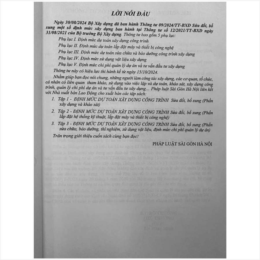 Nhằm phổ biến đến Quý Cơ quan, Đơn vị và Quý khách hàng thân thiết nắm bắt kịp thời những quy định mới nêu trên. Nhà sách Nam Việt xin trân trọng giới thiệu cuốn sách: Định Mức DTXD Công Trình sửa đổi, bổ sung 2024 – Phần Xây Dựng và Khảo Sát (tập 1) theo Thông Tư số 09/2024/TT-BXD
