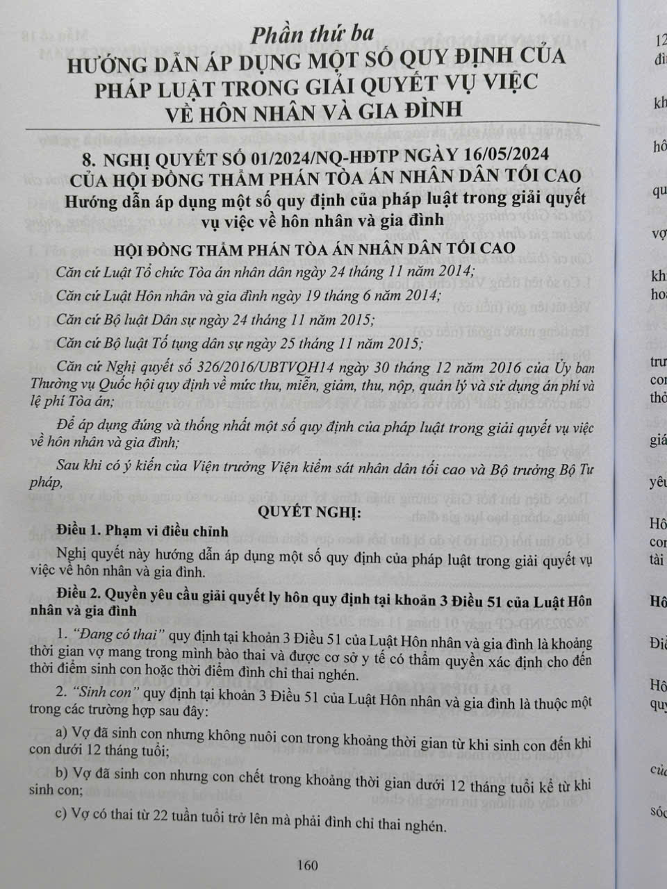 Gần đây nhất, ngày 16/05/2024, Hội đồng thẩm phán Tòa án nhân dân tối cao ban hành Nghị quyết 01/2024/NQ-HĐTP về việc hướng dẫn áp dụng một số quy định của pháp luật trong giải quyết vụ việc về hôn nhân và gia đình. Nghị quyết gồm 12 điều, có hiệu lực thi hành kể từ ngày 01/07/2024.