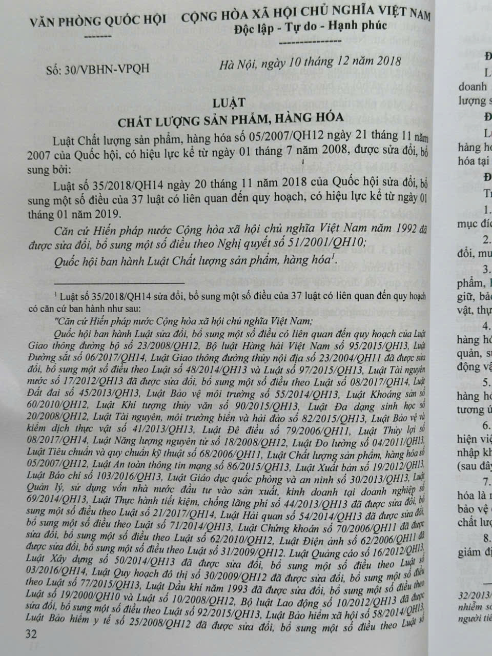 Ngày 18 tháng 6 năm 2025 tại kỳ họp thứ 9 Quốc hội khóa XV, Quốc hội nước Cộng hòa xã hội chủ nghĩa Việt Nam đã thông qua Luật số 78/2025/QH15 ngày 18 tháng 6 năm 2025 của Quốc hội ban hành Luật sửa đổi, bổ sung một số điều của Luật Chất lượng sản phẩm, hàng hóa số 05/2007/QH12 đã được sửa đổi, bổ sung một số điều theo Luật số 35/2018/QH14.