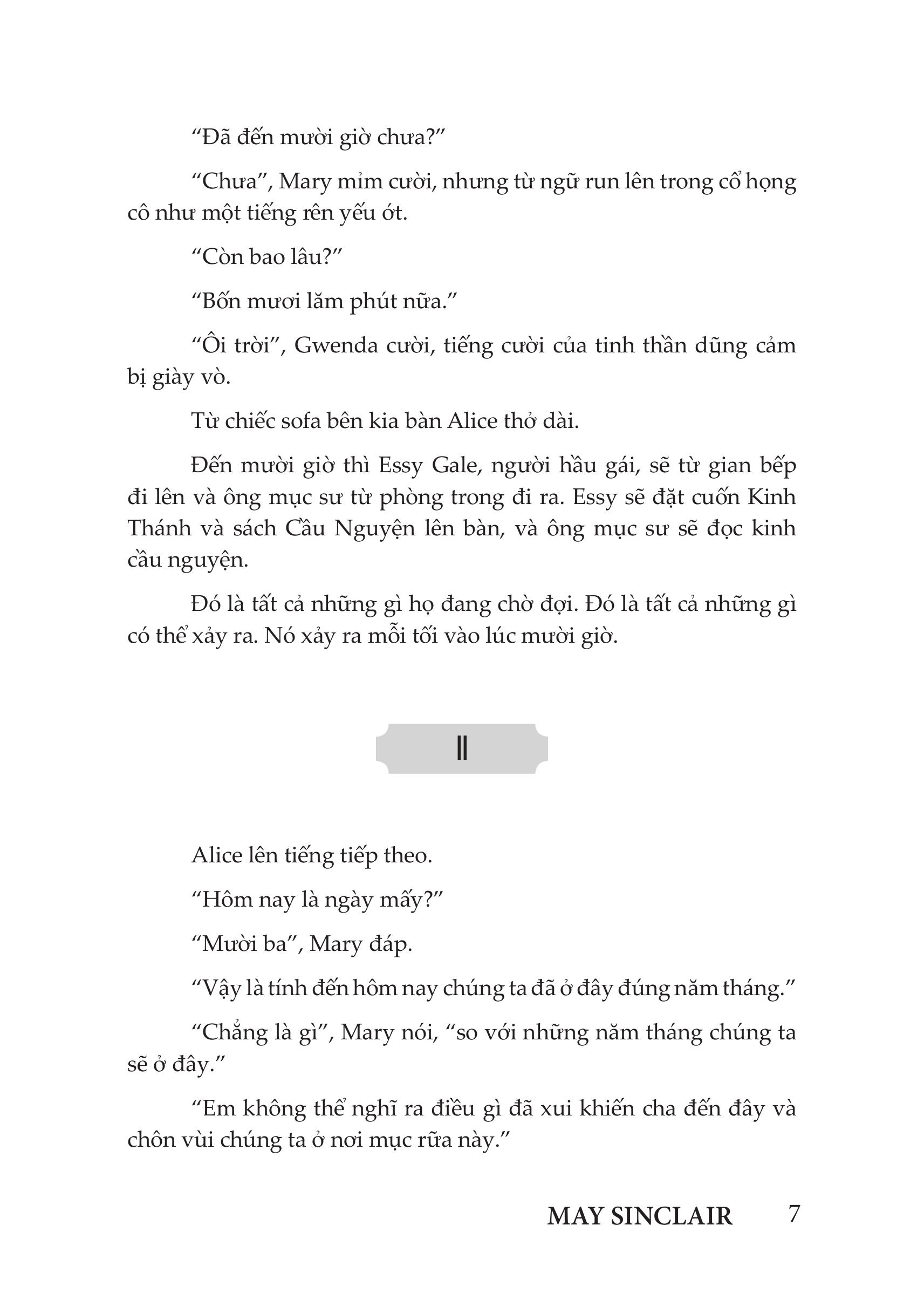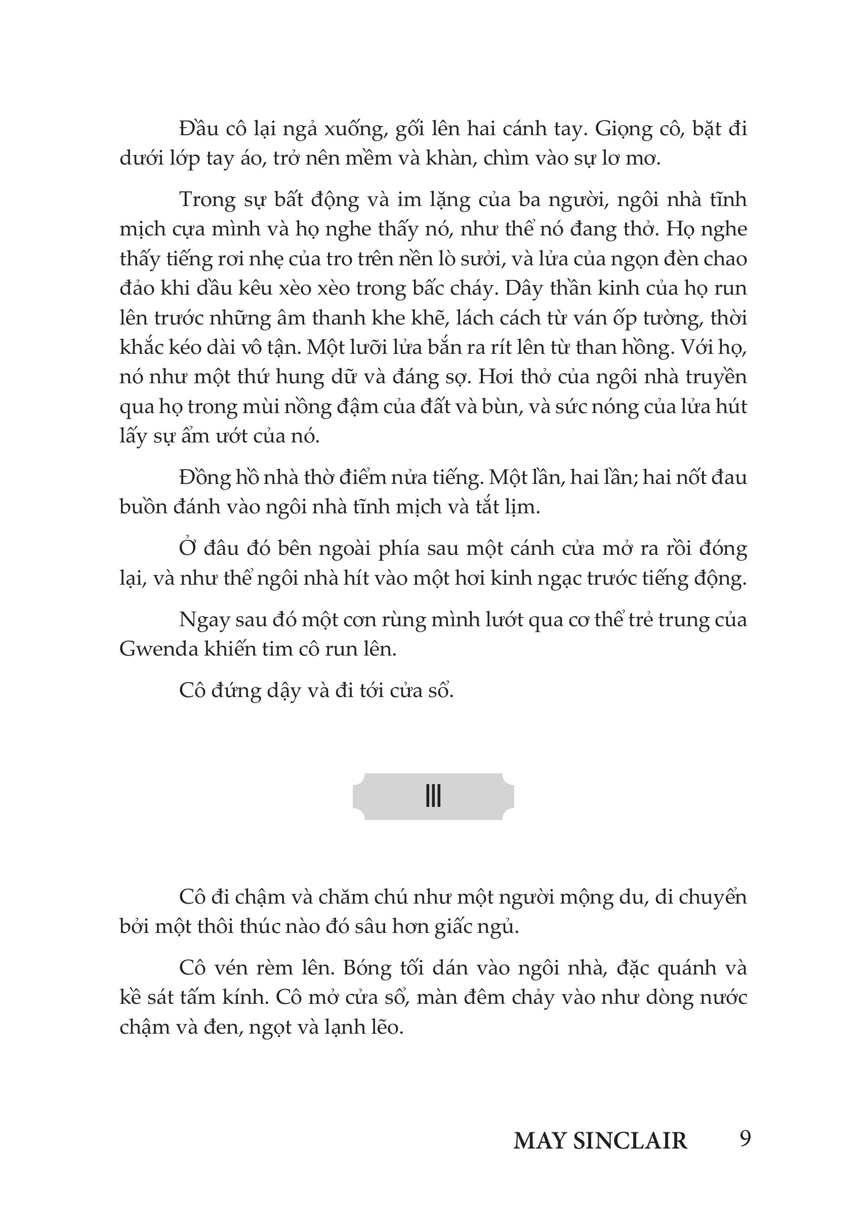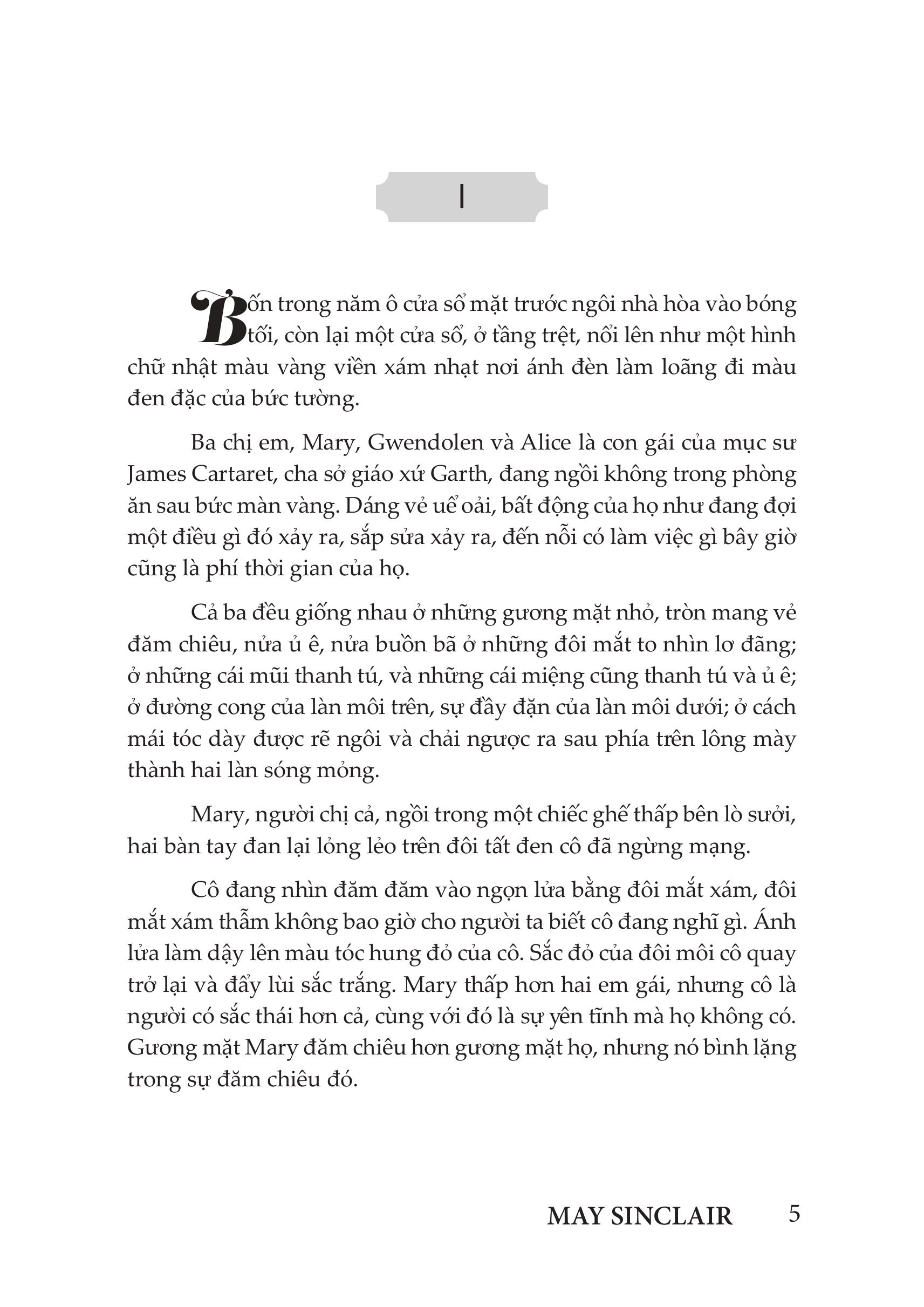 May Sinclair (1863 - 1946) tên thật là Mary Amelia St. Clair - Là một nhà văn, nhà thơ, nhà phê bình và nhà hoạt động nữ quyền tại Anh. Bà từng là thành viên Liên đoàn Nữ nhà văn đấu tranh cho quyền bầu cử của phụ nữ, một dấu ấn quan trọng định hình tư tưởng và sáng tác của bà.