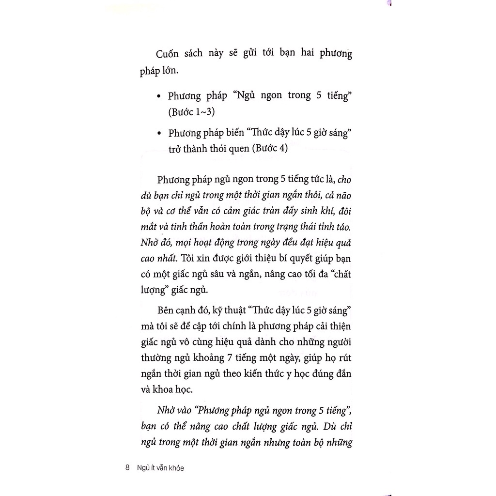 Gửi tới bạn – người đang vướng phải những phiền muộn sau: – Ngủ bao lâu cũng không hết cảm giác mệt mỏi – Luôn thức dậy buổi sáng trong trạng thái uể oải – Dễ bị tỉnh giấc, trằn trọc cho tới nửa đêm – Không đủ thời gian dành cho giấc ngủ – Trải qua mỗi ngày với quỹ thời gian eo hẹp Và bạn cũng nhận ra điều đó, bạn cũng biết những người thành công đều ngủ ít hơn bình thường nhưng năng suất công việc của họ vẫn luôn hiệu quả. Bạn cũng cố gắng rèn luyện bản thân mình nhưng có thể vì 2 lý do dưới đây sẽ làm bạn bỏ cuộc: – Không thể thức dậy sớm, dù cố gắng đến mấy cũng không duy trì được – Buồn ngủ trong suốt cả một ngày nếu như dậy sớm. Mức độ tốt và xấu của giấc ngủ không thể chỉ đo bằng “thời gian”. Chất lượng giấc ngủ = “Thời gian” x “Chất lượng”. Nếu có thể lĩnh hội “Phương pháp ngủ ngon trong 5 tiếng” được giới thiệu trong cuốn sách Ngủ ít vẫn khỏe,