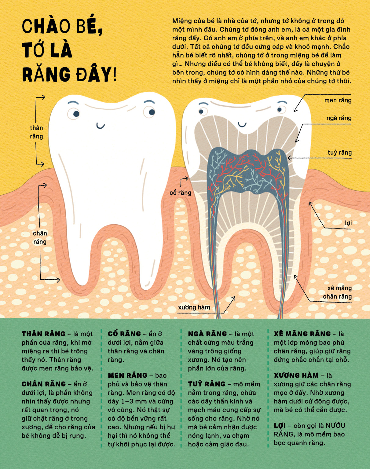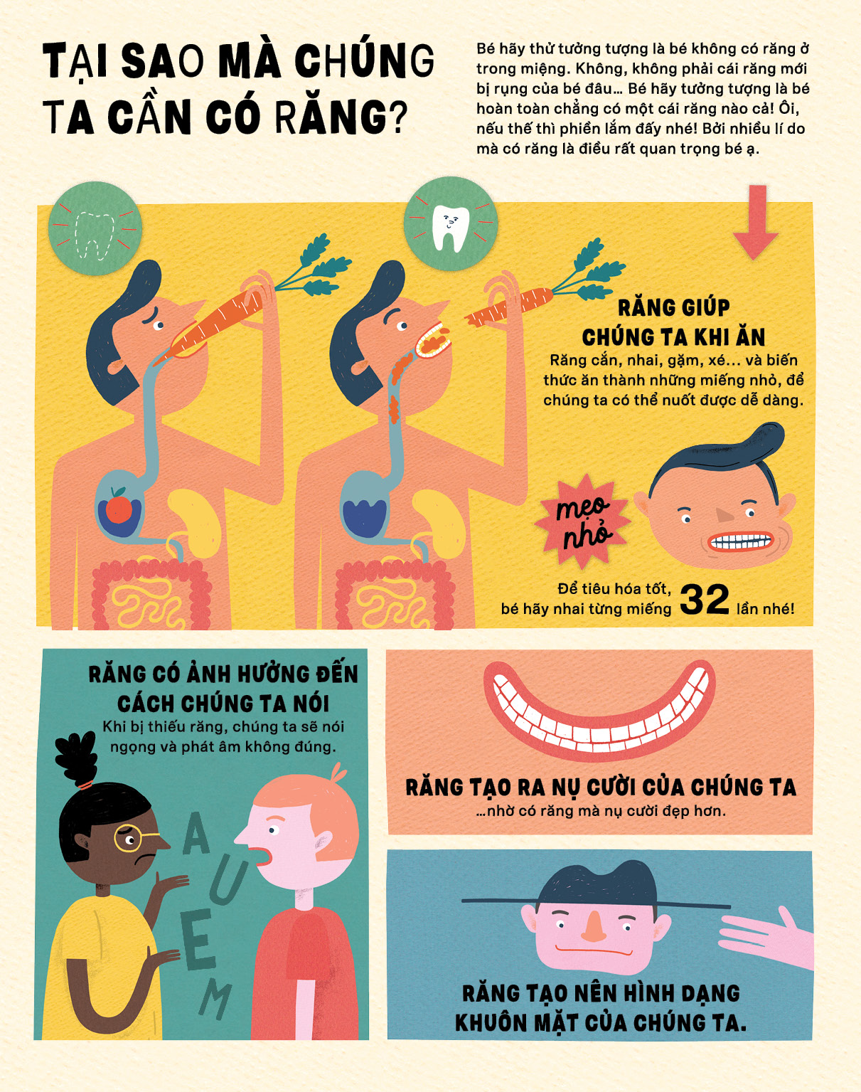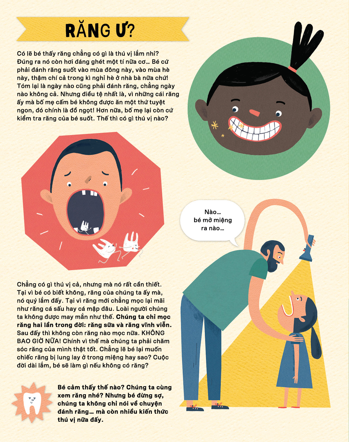 Tất cả những thắc mắc ngộ nghĩnh ấy sẽ được giải đáp trong " Răng: Tớ chỉ mọc 2 lần thôi " – cuốn "bách khoa toàn thư gói gọn tất cả những điều mà một độc giả nhí khao khát muốn biết về nụ cười của mình.