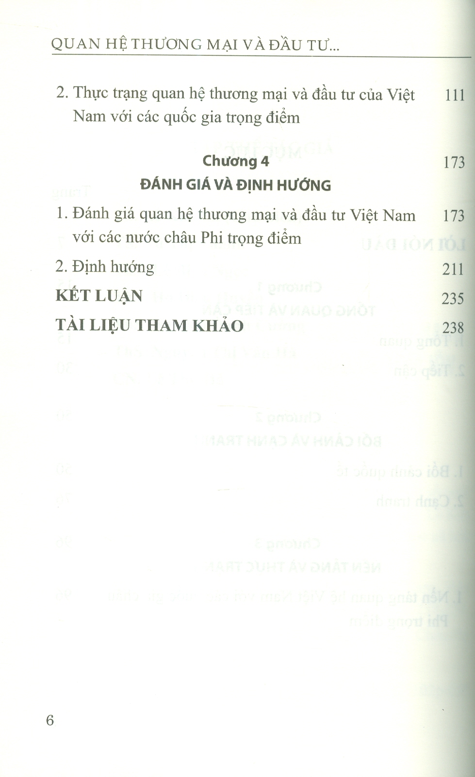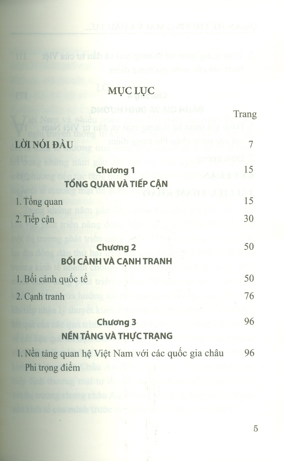Thực trạng hợp tác kinh tế: Phân tích sự tăng trưởng của kim ngạch thương mại song phương (tăng 2,5 lần từ 2010-2020) và hoạt động đầu tư của doanh nghiệp Việt Nam tại 12 nước châu Phi. Việt Nam chú trọng hợp tác trong các lĩnh vực có tính bổ trợ cao như trồng lúa, nuôi trồng thủy sản, cà phê, và khai thác khoáng sản (Chương 3).