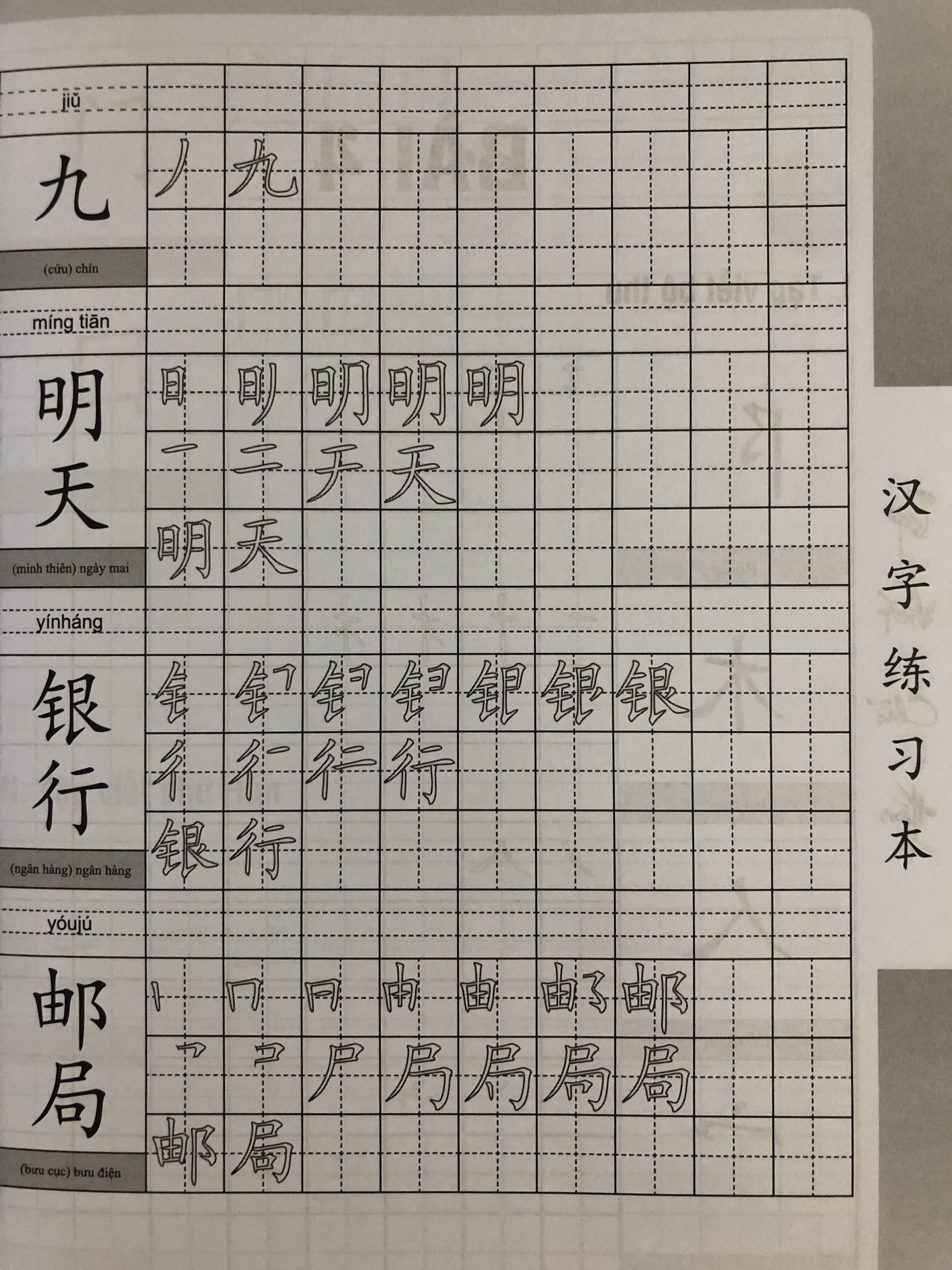 Phần tập viết phiên âm và tập viết các chữ Hán theo tứ tự từng nét một sẽ giúp các bạn học và nhớ chữ Hán lâu hơn.