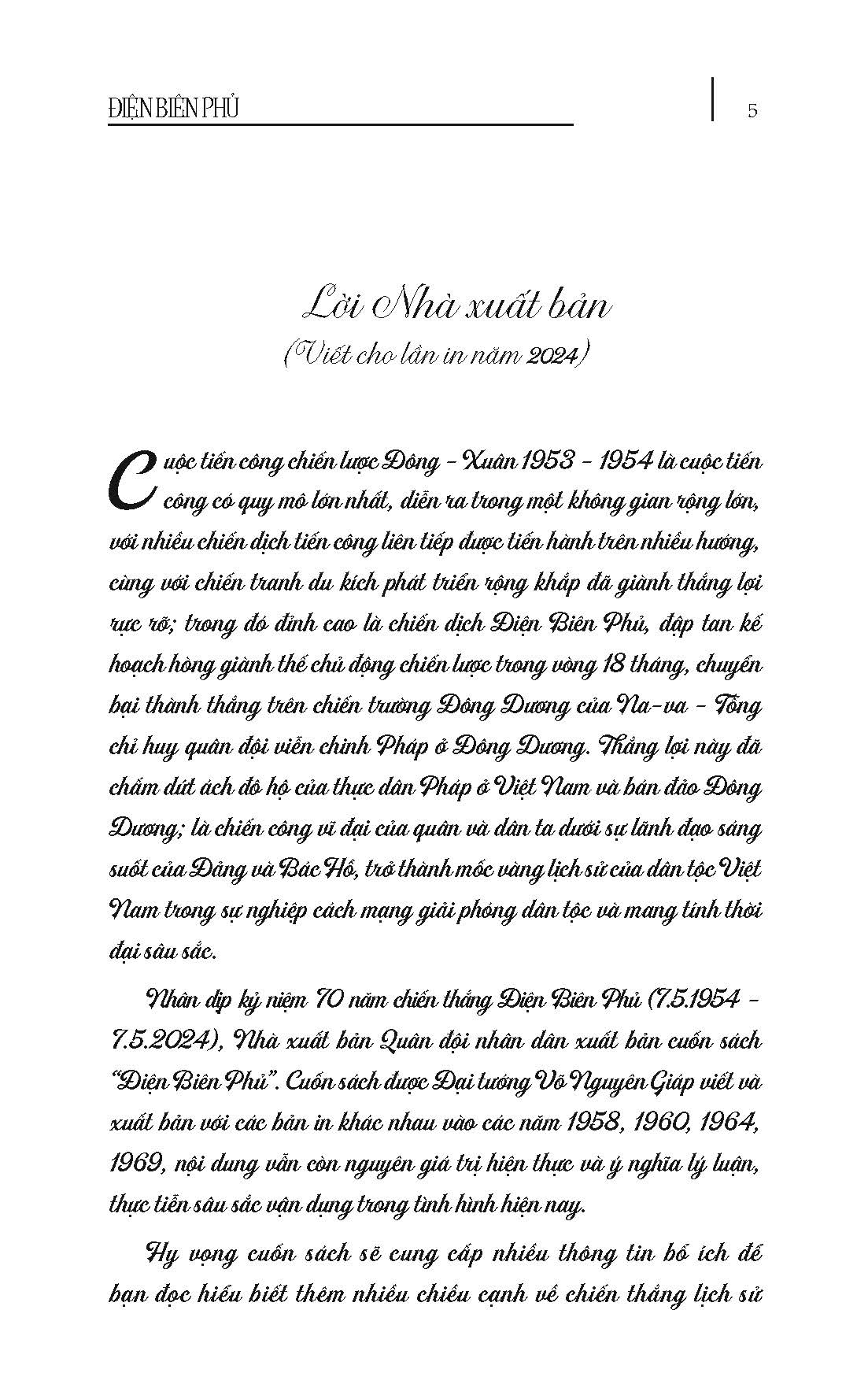 "Nhân dịp kỷ niệm 70 năm chiến thắng Điện Biên Phủ (7.5.1954 - 7.5.2024), Nhà xuất bản Quân đội nhân dân xuất bản cuốn sách “Điện Biên Phủ”. Cuốn sách được Đại tướng Võ Nguyên Giáp viết và xuất bản với các bản in khác nhau vào các năm 1958, 1960, 1964, 1969, nội dung vẫn cònnguyên giá trị hiện thực và ý nghĩa lý luận, thực tiễn sâu sắc vận dụng trong tình hình hiện nay.
