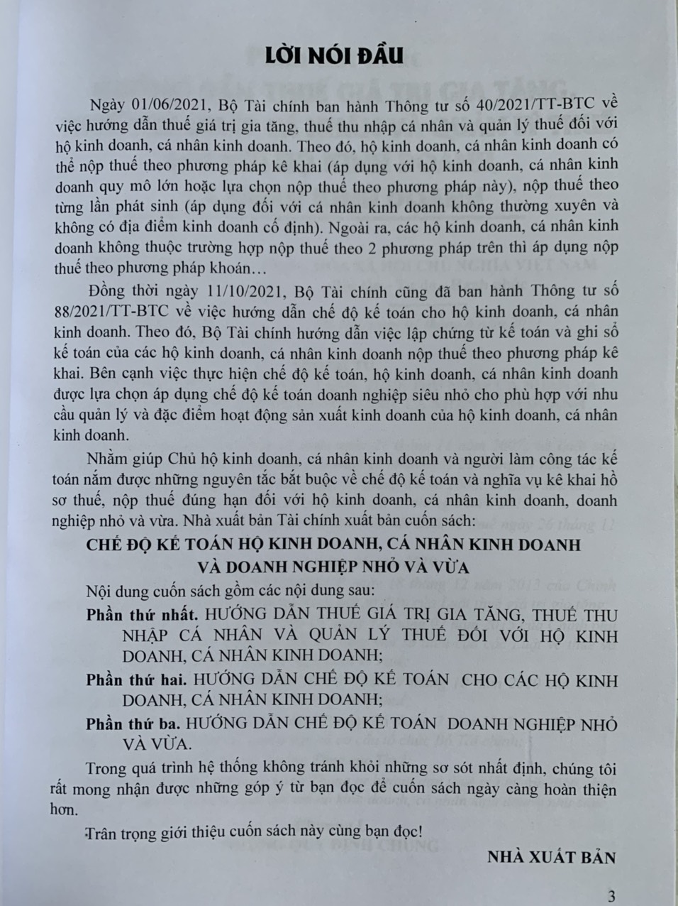 Nhằm giúp Chủ hộ kinh doanh, cá nhân kinh doanh và người làm công tác kế toán nắm được những nguyên tắc bắt buộc về chế độ kế toán và nghĩa vụ kê khai hồ sơ thuế, nộp thuế đúng hạn đối với hộ kinh doanh, cá nhân kinh doanh, doanh nghiệp nhỏ và vừa. Nhà xuất bản Tài chính xuất bản cuốn sách: