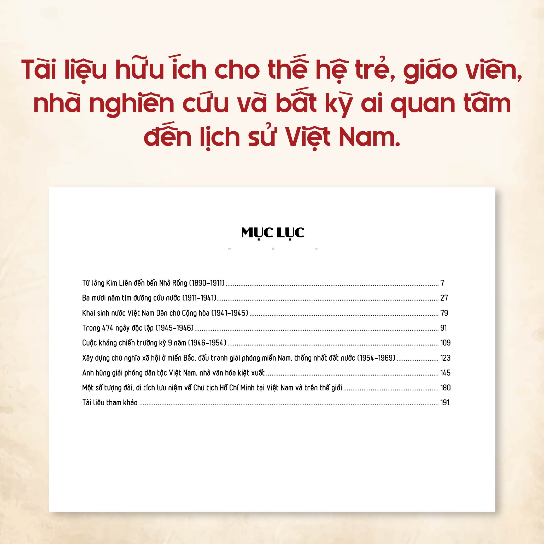 Từ những bức ảnh thôn quê nơi Người được sinh ra, các quốc gia Người từng đặt chân tới trên hành trình tìm đường cứu nước, một số bài báo Người từng viết hay giấy tờ, căn cước của Người khi còn hoạt động ở nước ngoài, đến hình ảnh Người trong thời kỳ kháng chiến gian nan hay những khoảnh khắc đời thường giản dị, cuốn sách dẫn dắt người xem đi qua từng chặng đường trong cuộc đời vĩ đại hơn nửa thế kỷ của vị cha già dân tộc.
