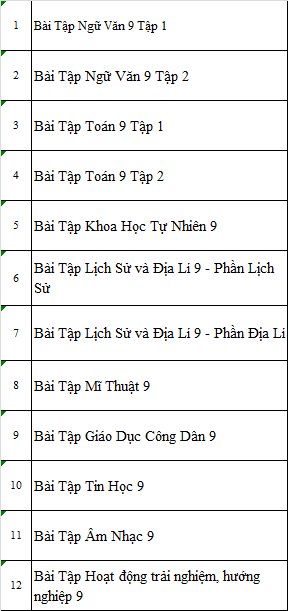 1 Bài Tập Ngữ Văn 9 Tập 1 2 Bài Tập Ngữ Văn 9 Tập 2 3 Bài Tập Toán 9 Tập 1 4 Bài Tập Toán 9 Tập 2 5 Bài Tập Khoa Học Tự Nhiên 9 6 Bài Tập Lịch Sử và Địa Lí 9 - Phần Lịch...