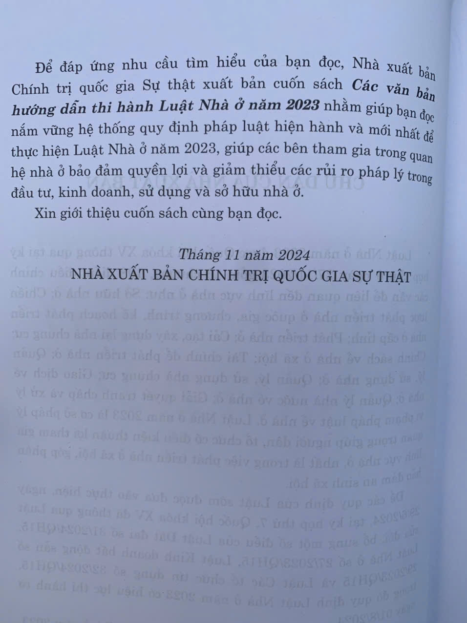 Nhà xuất bản Chính trị quốc gia Sự thật xuất bản cuốn sách Các văn bản hướng dẫn thi hành Luật Nhà ở năm 2023 nhằm giúp bạn đọc nắm vững hệ thống quy định pháp luật hiện hành và mới nhất để thực hiện Luật Nhà ở năm 2023, giúp các bên tham gia trong quan hệ nhà ở bảo đảm quyền lợi và giảm thiểu các rủi ro pháp lý trong