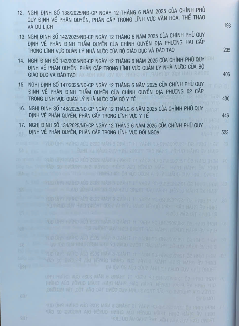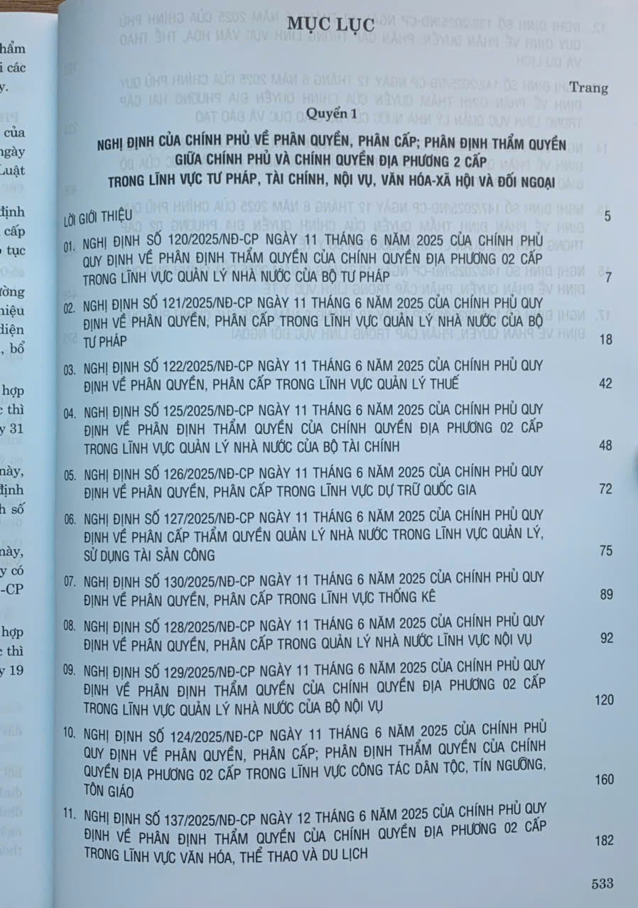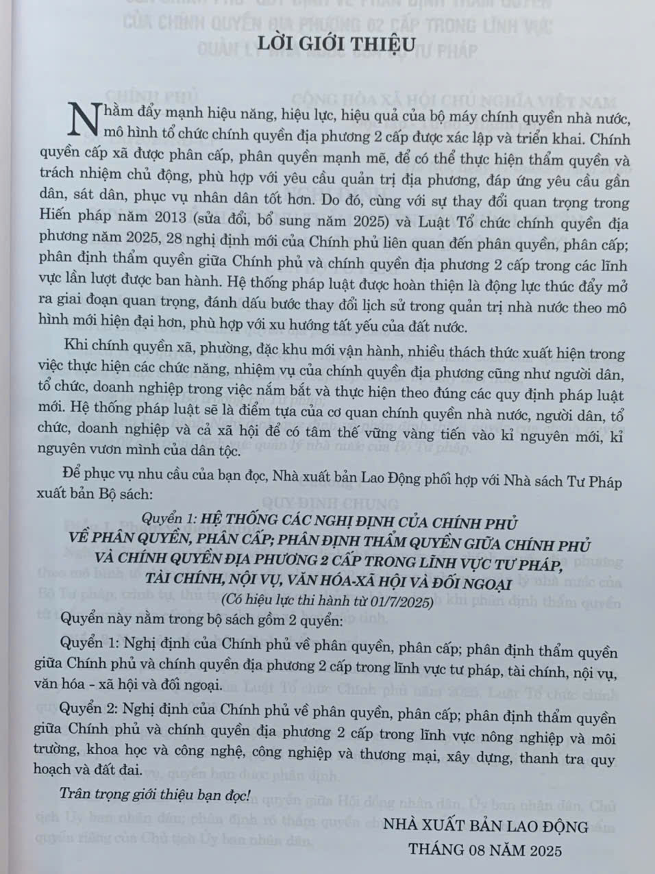 Bộ sách Hệ thống các nghị định của Chính phủ về phân quyền, phân cấp, phân định thẩm quyền giữa Chính phủ và chính quyền địa phương 2 cấp được xuất bản nhằm đáp ứng yêu cầu đổi mới quản trị quốc gia trong bối cảnh Hiến pháp 2013 (sửa đổi, bổ sung 2025) và Luật Tổ chức chính quyền địa phương 2025 có hiệu lực. Đây là bước đi quan trọng nhằm xây dựng mô hình chính quyền hiện đại, hiệu lực, hiệu quả, gần dân và phục vụ nhân dân tốt hơn.