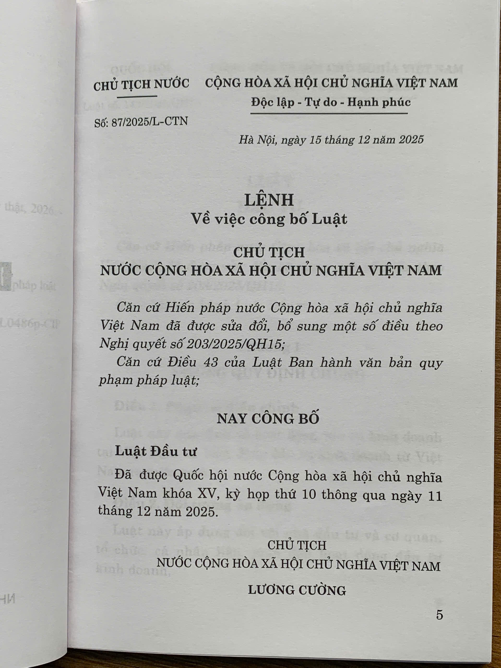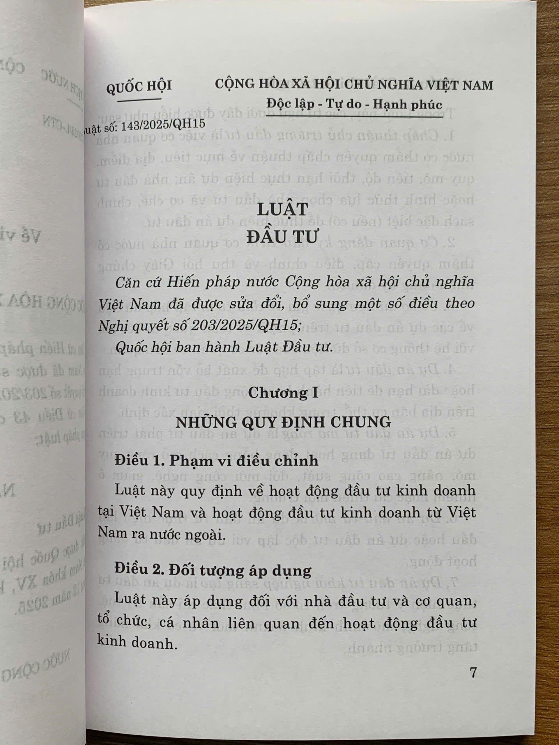 Luật Đầu tư 2025 – Luật số 143/2025/QH15, thông qua ngày 11/12/2025, ban hành ngày 15/12/2025, có hiệu lực từ 01/07/2026.