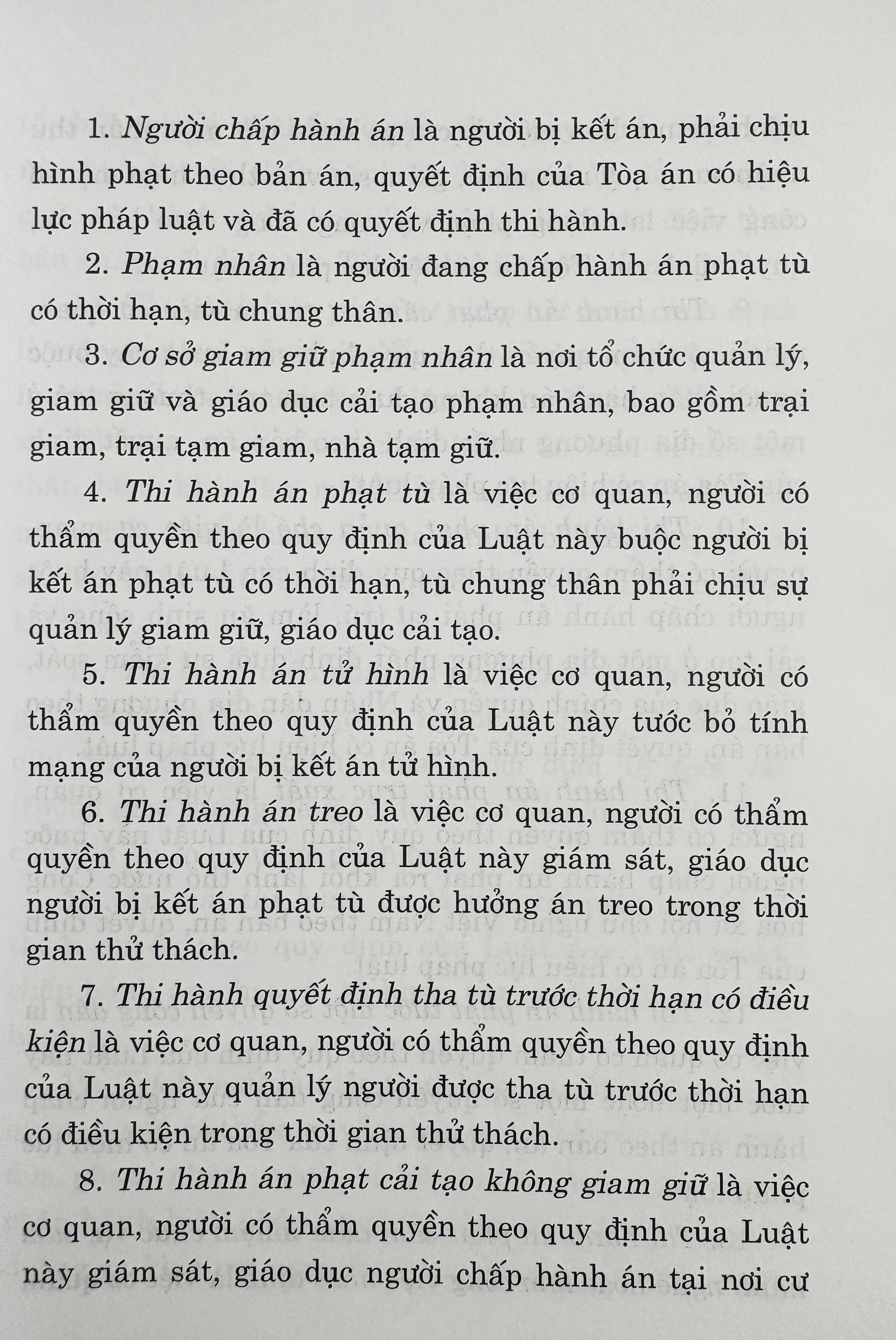 Luật này quy định nguyên tắc, trình tự, thủ tục, tổ chức, nhiệm vụ, quyền hạn của cơ quan, người có thẩm quyền trong thi hành bản án, quyết định về hình phạt tù, tử hình, cảnh cáo, cải tạo không giam giữ, cấm cư trú, quản chế, trục xuất, tước một số quyền công dân, cấm đảm nhiệm chức vụ, cấm hành nghề hoặc làm công việc nhất định, án treo, tha tù trước thời hạn có điều kiện, hình phạt đình chỉ hoạt động có thời hạn, đình chỉ hoạt động vĩnh viễn, cấm kinh doanh, cấm hoạt động trong một số lĩnh vực nhất định, cấm huy động vốn, biện pháp tư pháp; quyền, nghĩa vụ của người, pháp nhân thương mại chấp hành án hình sự, biện pháp tư pháp; trách nhiệm của cơ quan, tổ chức, cá nhân có liên quan trong thi hành án hình sự, biện pháp tư pháp.