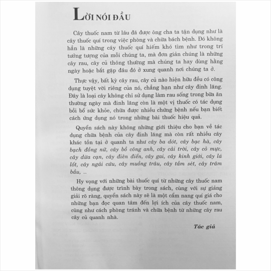 Hy vọng với những bài thuốc quí từ những cây thuốc nam thông dụng được trình bày trong sách, cùng với sự giảng giải rõ ràng, quyển sách này sẽ là một cẩm nang quí giá cho những bạn đọc quan tâm đến lợi ích của cây thuốc, vị thuốc trong vườn nhà.