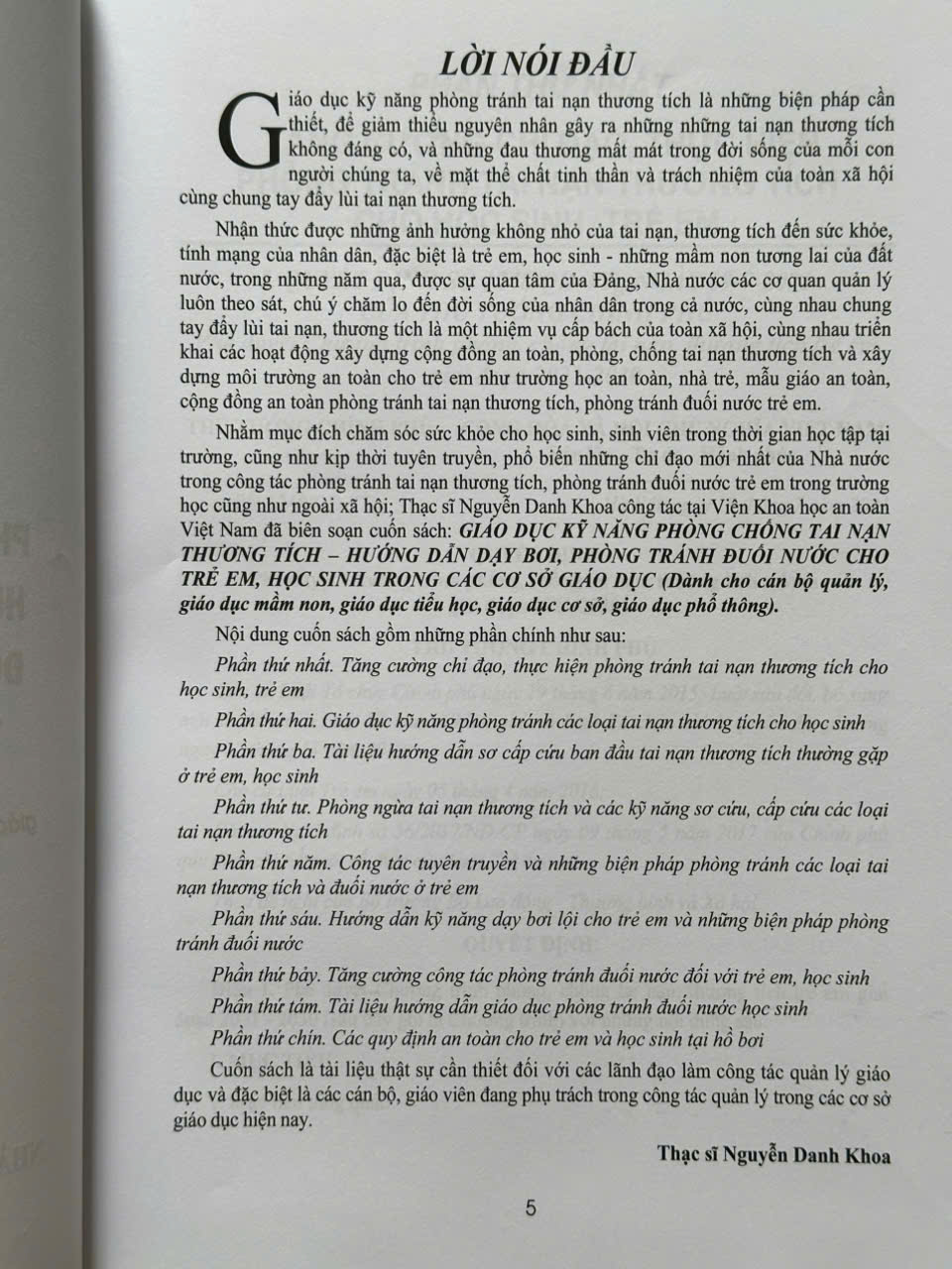 Nhằm mục đích chăm sóc sức khỏe cho học sinh, sinh viên trong thời gian học tập tại trường, cũng như kịp thời tuyên truyền, phố biến những chỉ đạo mới nhất của Nhà nước trong công tác phòng tránh tai nạn thương tích, phòng tránh đuôi nước trẻ em trong trường học cũng như ngoài xã hội; Thạc sĩ Nguyễn Danh Khoa công tác tại Viện Khoa học an toàn Việt Nam đã biên soạn cuốn sách: GIÁO DỤC KỸ NĂNG PHÒNG CHỐNG TẠI NẠN THƯƠNG TÍCH – HƯỚNG DẪN DẠY BƠI, PHÒNG TRÁNH ĐUỔI NƯỚC CHO TRẺ EM, HỌC SINH TRONG CÁC CƠ SỞ GIÁO DỤC (Dành cho cán bộ quản lý, giáo dục mầm non, giáo dục tiểu học, giáo dục cơ sở, giáo dục phổ thông).