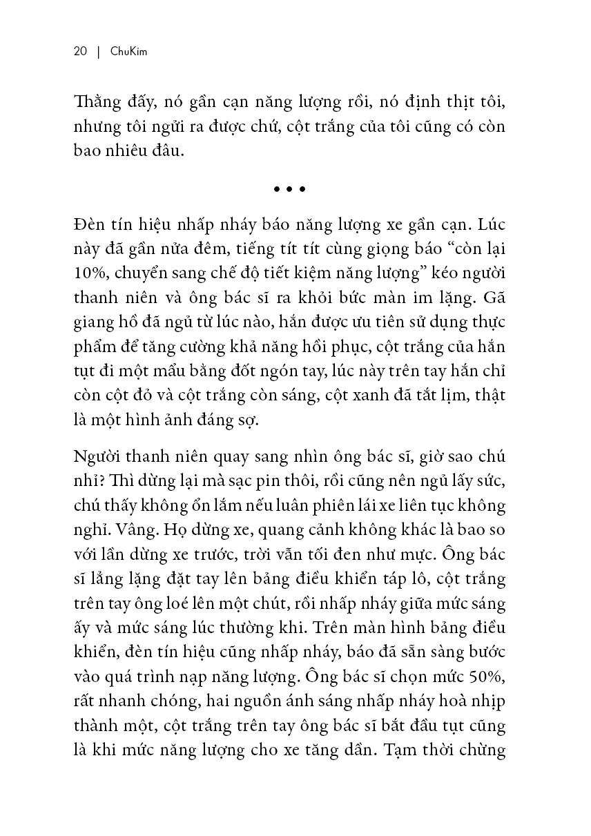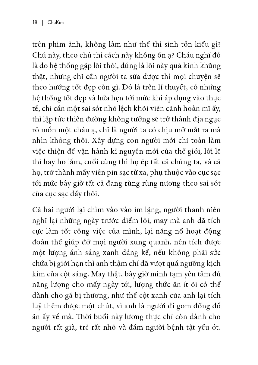 Phần lớn các câu chuyện diễn ra trong những bối cảnh giả tưởng – nơi xã hội được tổ chức lại theo cách cực đoan: từ hệ thống phân phối năng lượng dựa trên số việc thiện đã làm, cho đến quay xổ số ra khả năng có con, cho đến việc phân bổ giới tính dựa trên nhu cầu xã hội. Tuy ý tưởng “nặng đô” là vậy nhưng điều khiến các truyện không trượt thành bài tiểu luận, không rao giảng triết học dạy đời chính là cách tác giả ChuKim ném các nhân vật của mình vào bối cảnh và đứng nhìn từ xa, bình tĩnh quan sát cách họ vẫy vùng trong lạ lẫm, hoài nghi, đơn độc.