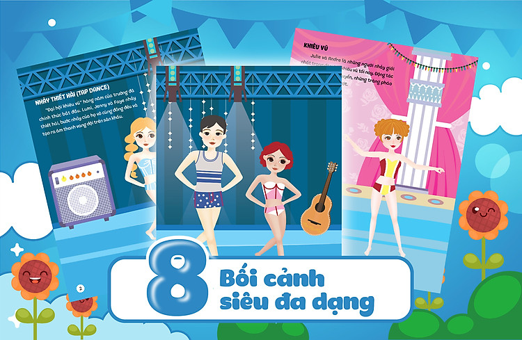 - Bối cảnh đa dạng theo từng chủ đề cùng với hơn 24 nhân vật, 100 stickers quần áo và phụ kiện cho con được hóa thân thành nhà tạo mẫu thời trang, thỏa sức sáng tạo, giúp bé tránh xa điện thoại, và trò chơi điện tử.