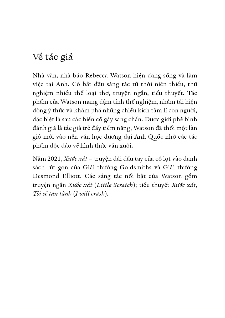 Little scratch là tiểu thuyết đầu tay của Rebecca Watson, được xuất bản năm 2021 và nhanh chóng gây tiếng vang với hình thức trình bày táo bạo, lời văn sắc sảo, trung thực đến trần trụi. Tác phẩm được đề cử cho nhiều giải thưởng văn học như Goldsmiths Prize và Desmond Elliott Prize, khẳng định vị thế của Watson như một trong những giọng văn nữ đương đại quan trọng nhất của nước Anh.