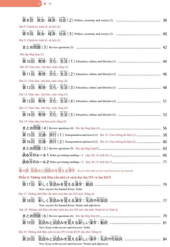➀Các bạn sẽ học cách đọc và những chữ Hán cần thiết cho mức độ N3 kỳ thi năng lực tiếng Nhật thông qua 25 bài khóa. Trong đó, có 354 chữ Hán mới và cách đọc cùng với cách đọc mới của 88 chữ Hán đã học ở mức độ N4, N5.